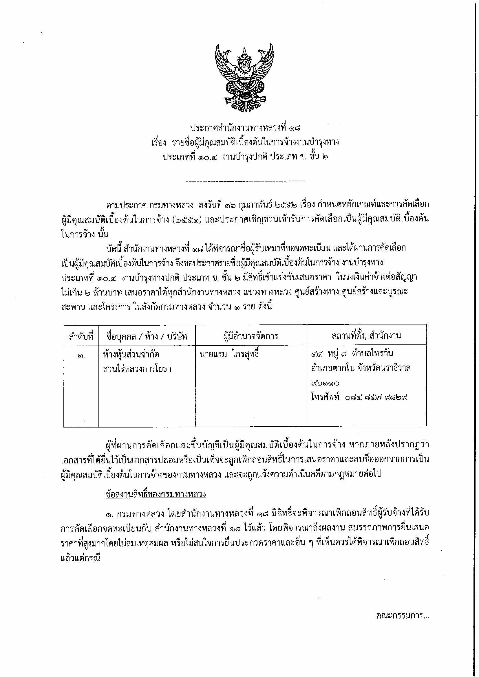ประกาศรายชื่อ ผู้มีคุณสมบัติเบื้องต้นในการจ้างงานบำรุงทาง -ประเภทที่ 10.4 งานบำรุงทางปกติ ประเภท ข. ชั้น 2