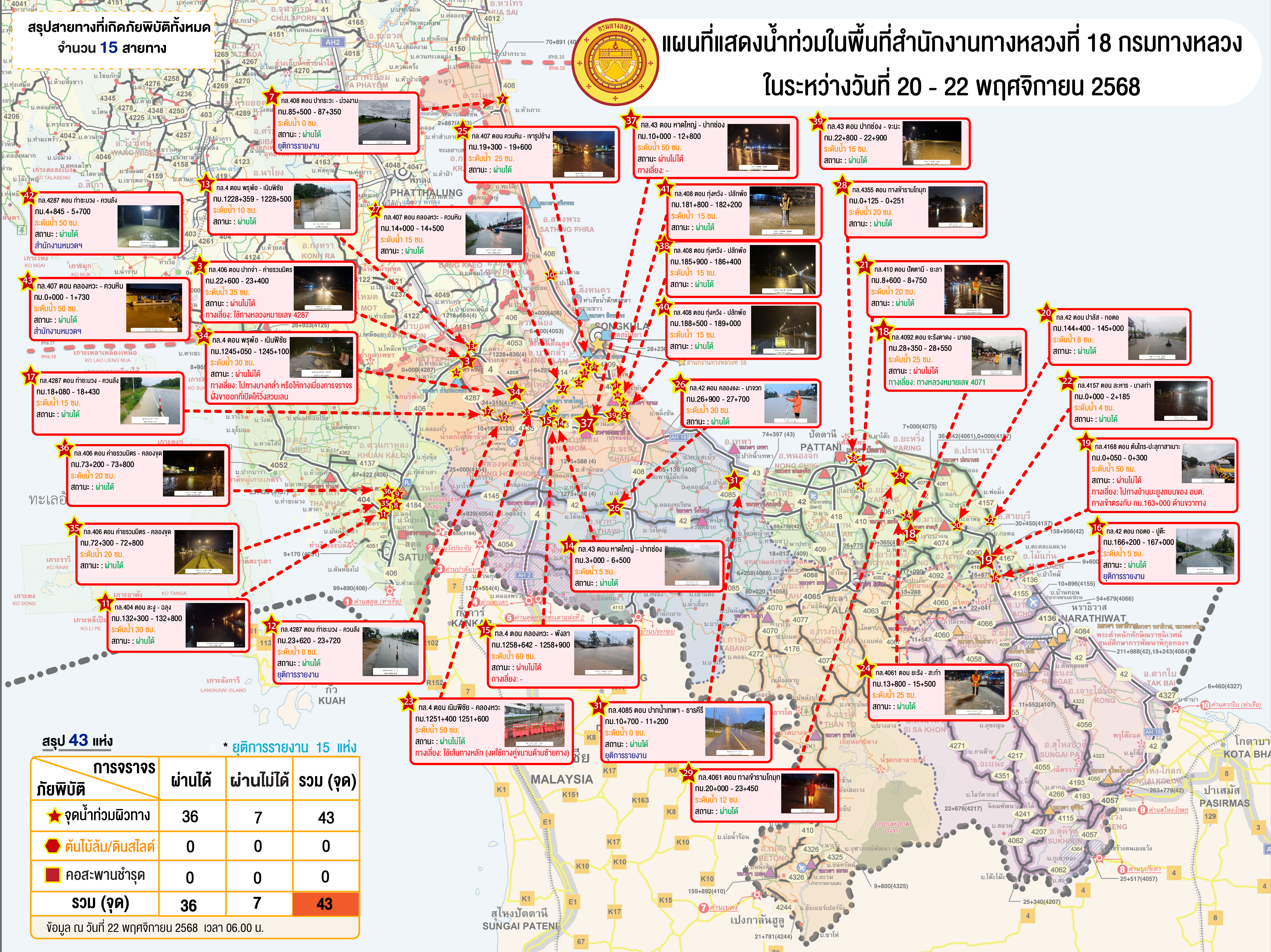 รายงานน้ำท่วมในระหว่างวันที่ 20-22 พ.ย. 68 ประจำวันที่ 22 พ.ย. 68 ณ เวลา 06.00 น.
