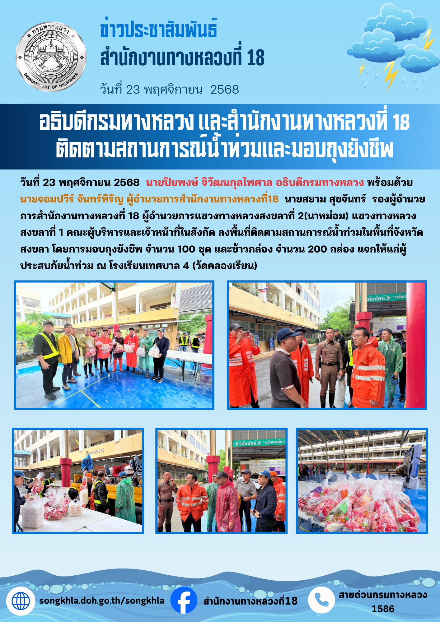 วันที่ 23 พฤศจิกายน 2568 นายปิยพงษ์ จิวัฒนกุลไพศาล อธิบดีกรมทางหลวง พร้อมด้วยนายจอมปวีร์ จันทร์หิรัญ ผู้อำนวยการสำนักงานทางหลวงที่18 นายสยาม สุขจันทร์ รองผู้อำนวยการสำนักงานทางหลวงที่ 18 ผู้อำนวยการแขวงทางหลวงสงขลาที่ 2(นาหม่อม) แขวงทางหลวงสงขลาที่ 1 คณะผู้บริหารและเจ้าหน้าที่ในสังกัด ลงพื้นที่ติดตามสถานการณ์น้ำท่วมในพื้นที่จังหวัดสงขลา โดยการมอบถุงยังชีพ จำนวน 100 ชุด และข้าวกล่อง จำนวน 200 กล่อง แจกให้แก่ผู้ประสบภัยน้ำท่วม ณ โรงเรียนเทศบาล 4 (วัดคลองเรียน)