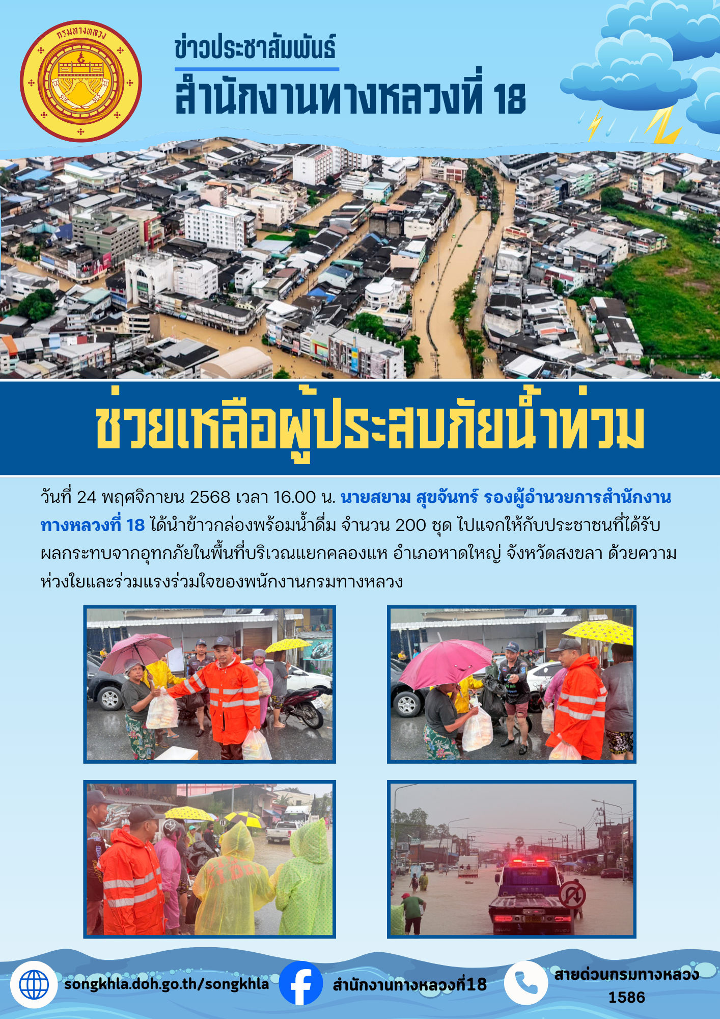 วันที่ 24 พฤศจิกายน 2568 เวลา 16.00 น. นายสยาม สุขจันทร์ รองผู้อำนวยการสำนักงานทางหลวงที่ 18 ได้นำข้าวกล่องพร้อมน้ำดื่ม จำนวน 200 ชุด ไปแจกให้กับประชาชนที่ได้รับผลกระทบจากอุทกภัยในพื้นที่บริเวณแยกคลองแห อำเภอหาดใหญ่ จังหวัดสงขลา ด้วยความห่วงใยและร่วมแรงร่วมใจของพนักงานกรมทางหลวง