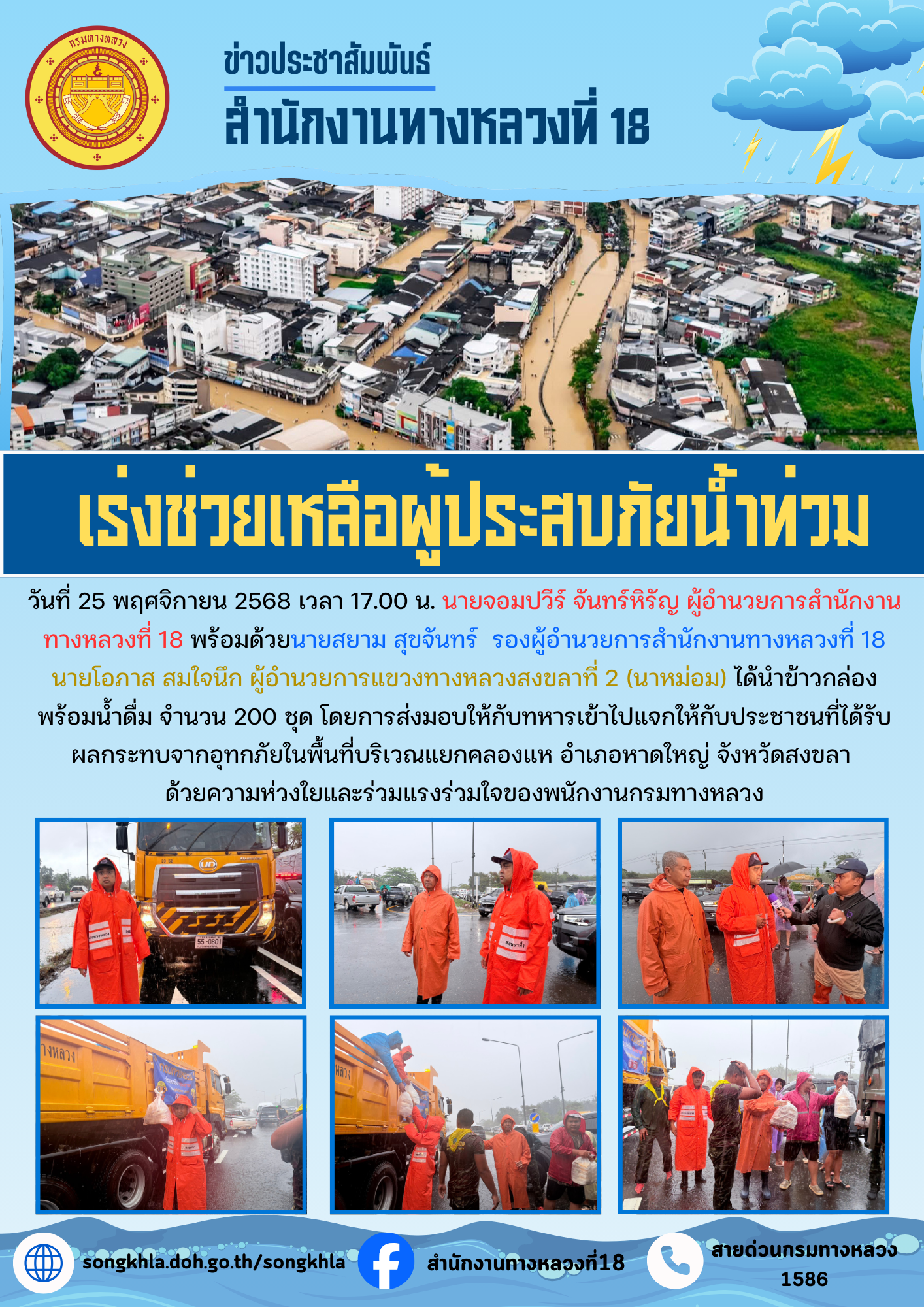 วันที่ 25 พฤศจิกายน 2568 เวลา 17.00 น. นายจอมปวีร์ จันทร์หิรัญ ผู้อำนวยการสำนักงานทางหลวงที่ 18 พร้อมด้วยนายสยาม สุขจันทร์ รองผู้อำนวยการสำนักงานทางหลวงที่ 18 นายโอภาส สมใจนึก ผู้อำนวยการแขวงทางหลวงสงขลาที่ 2 (นาหม่อม) ได้นำข้าวกล่องพร้อมน้ำดื่ม จำนวน 200 ชุด โดยการส่งมอบให้กับทหารเข้าไปแจกให้กับประชาชนที่ได้รับผลกระทบจากอุทกภัยในพื้นที่บริเวณแยกคลองแห อำเภอหาดใหญ่ จังหวัดสงขลา ด้วยความห่วงใยและร่วมแรงร่วมใจของพนักงานกรมทางหลวง