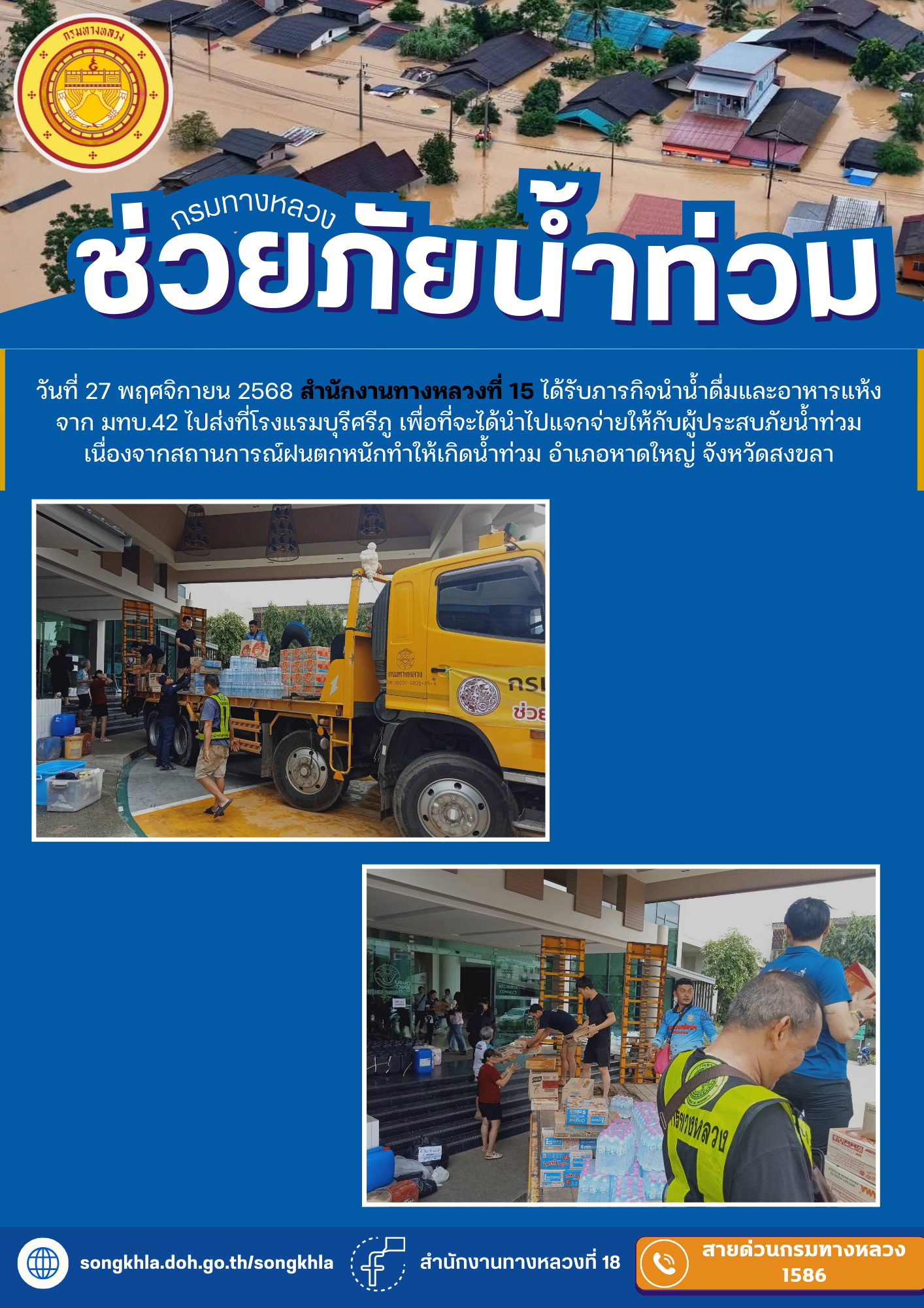 ?? วันที่ 27 พฤศจิกายน 2568 สำนักงานทางหลวงที่ 15 ได้รับภารกิจนำน้ำดื่มและอาหารแห้งจาก มทบ.42 ไปส่งที่โรงแรมบุรีศรีภู เพื่อที่จะได้นำไปแจกจ่ายให้กับผู้ประสบภัยน้ำท่วม เนื่องจากสถานการณ์ฝนตกหนักทำให้เกิดน้ำท่วม อำเภอหาดใหญ่ จังหวัดสงขลา