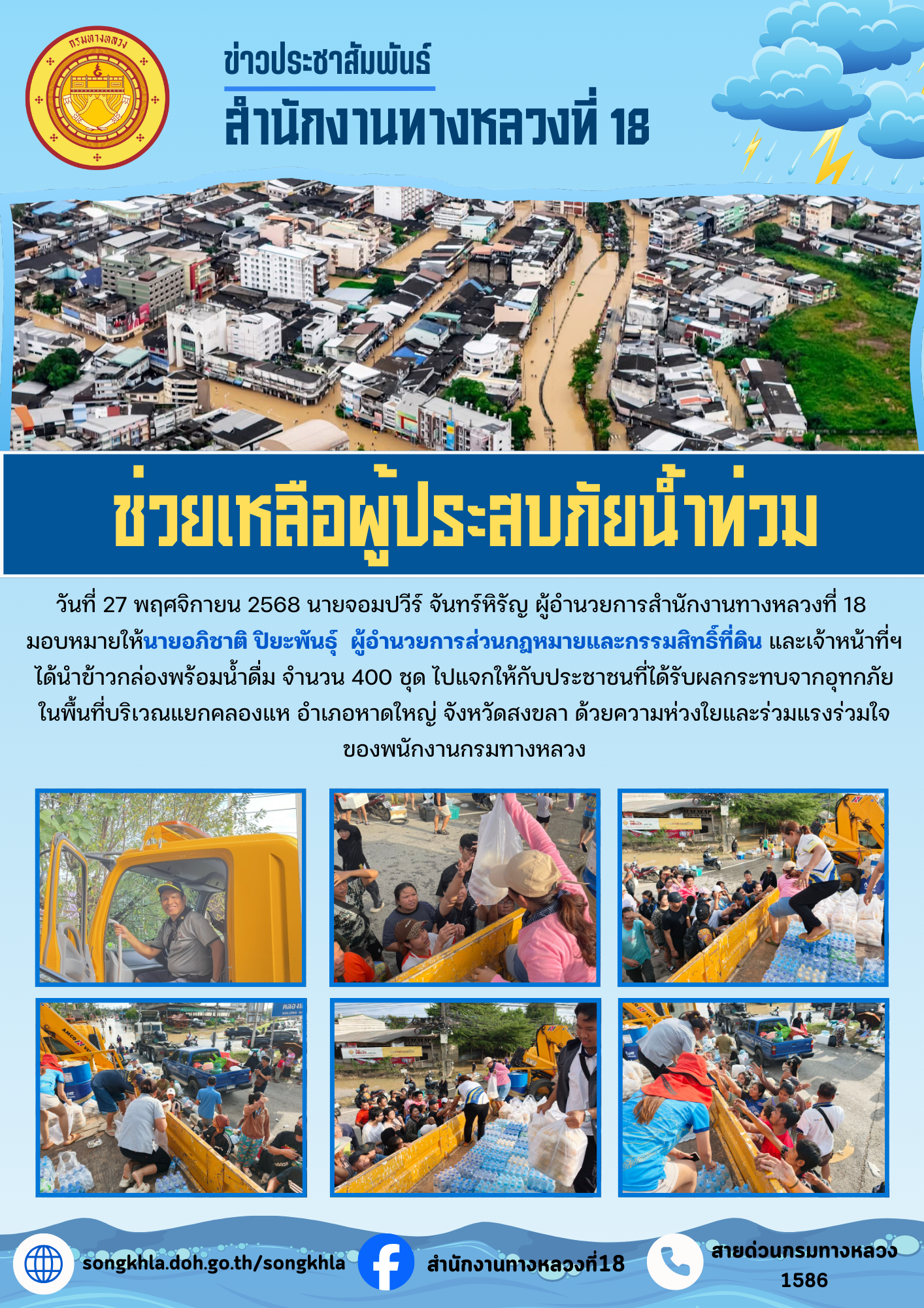 วันที่ 27 พฤศจิกายน 2568 นายจอมปวีร์ จันทร์หิรัญ ผู้อำนวยการสำนักงานทางหลวงที่ 18 มอบหมายให้นายอภิชาติ ปิยะพันธุ์ ผู้อำนวยการส่วนกฎหมายและกรรมสิทธิ์ที่ดิน และเจ้าหน้าที่ฯ ได้นำข้าวกล่องพร้อมน้ำดื่ม จำนวน 400 ชุด ไปแจกให้กับประชาชนที่ได้รับผลกระทบจากอุทกภัยในพื้นที่บริเวณแยกคลองแห อำเภอหาดใหญ่ จังหวัดสงขลา ด้วยความห่วงใยและร่วมแรงร่วมใจของพนักงานกรมทางหลวง