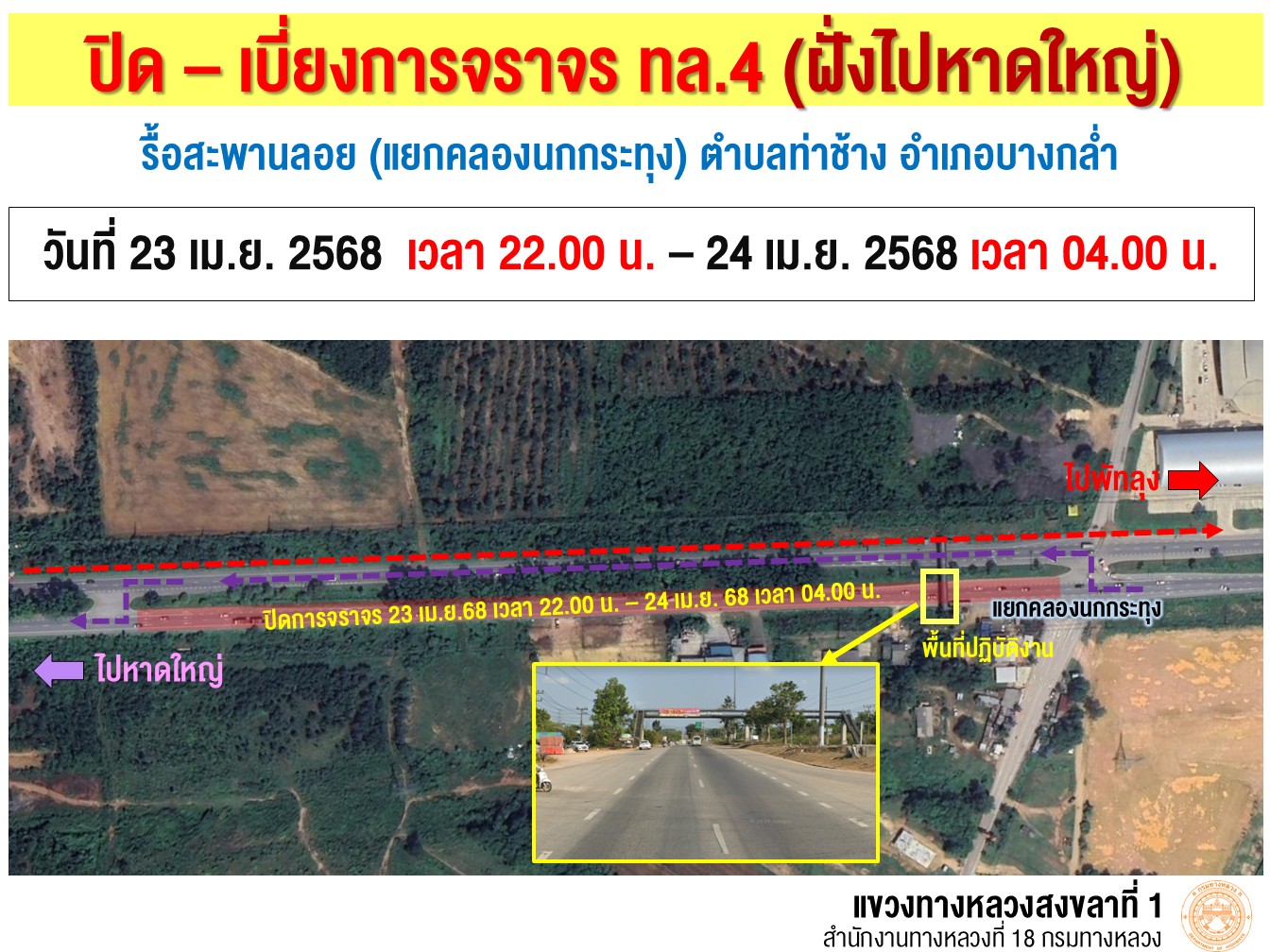 แจ้งปิด-เบี่ยงช่องจราจร ทางหลวงหมายเลข 4 เพื่อรื้อสะพานลอย บริเวณแยกคลองนกกระทุง