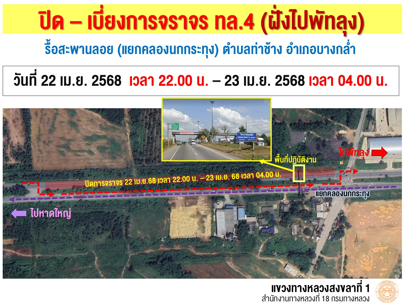 แขวงทางหลวงสงขลาที่ 1 ขอแจ้งปิด-เบี่ยงช่องจราจร ทางหลวงหมายเลข 4 เพื่อรื้อสะพานลอย บริเวณแยกคลองนกกระทุง ต.ท่าช้าง อ.บางกล่ำ จ.สงขลา??