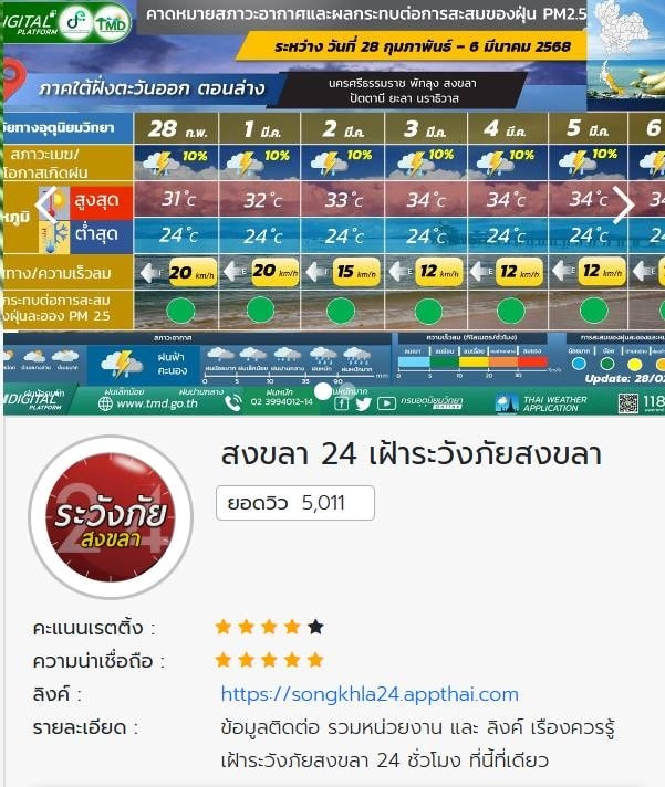 เฝ้าระวังภัยให้จังหวัดสงขลา เป็นบริการสาธารณะ มีการเชื่อมโยงข้อมูลองค์กรด้านการเฝ้าระวังภัยพิบัติ และการช่วยให้ข้อมูลประชาชนได้ระดับหนึ่งเป็นระยะเวลา 5 ปี โดยโรงเรียนไทยคอมฯ สามารถติดตามข่าวสารได้ที่เว็บไซต์ ?? https://songkhla24.appthai.com/